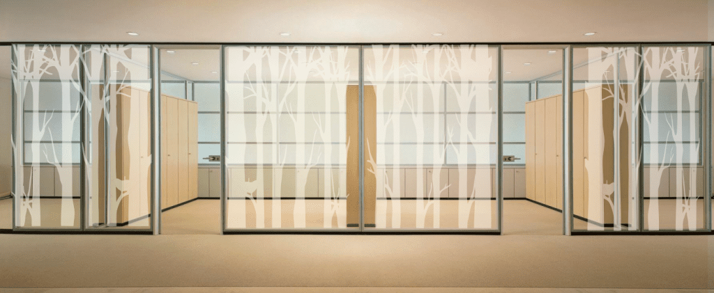 - Gamtos motyvais ornamentuotas stiklas suteikia šiek tiek intymumo dirbantiems žmonėms ir padeda susikaupti.