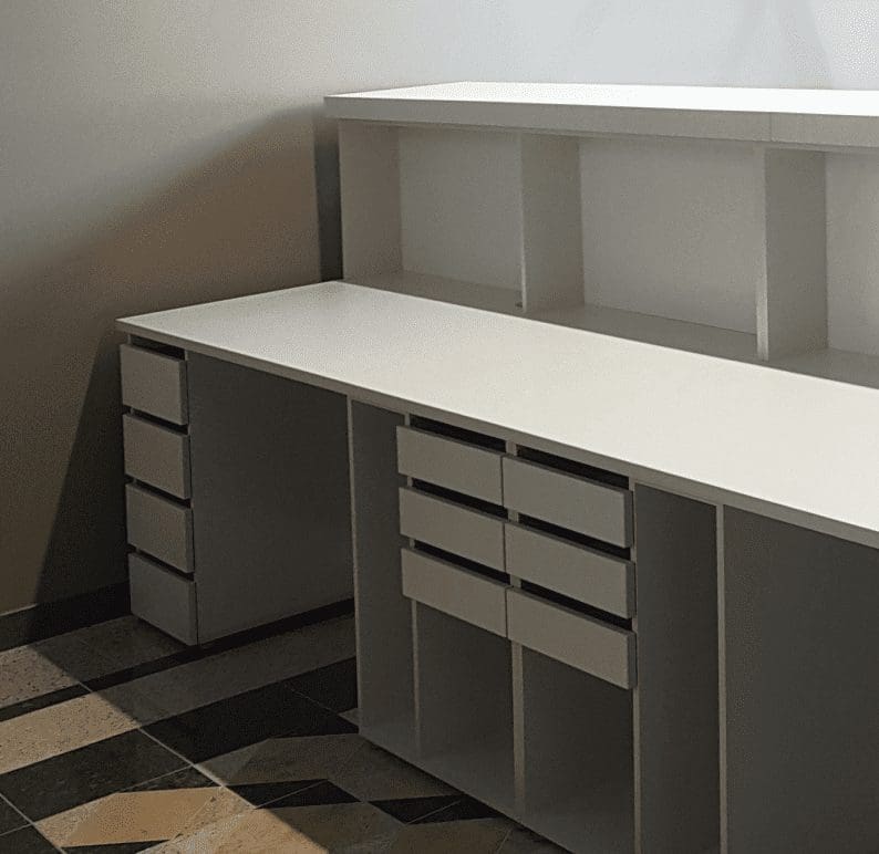 Agnietė panaudojo Art Deco principus – paprastumą, modernumą, kontrastingų spalvų bei medžiagų derinimą tarpusavyje. Recepcija lakoniška išorėje, o vidinėje pusėje gausu lentynėlių, įvairaus dydžio stalčiukų. Todėl labai patogi darbuotis.